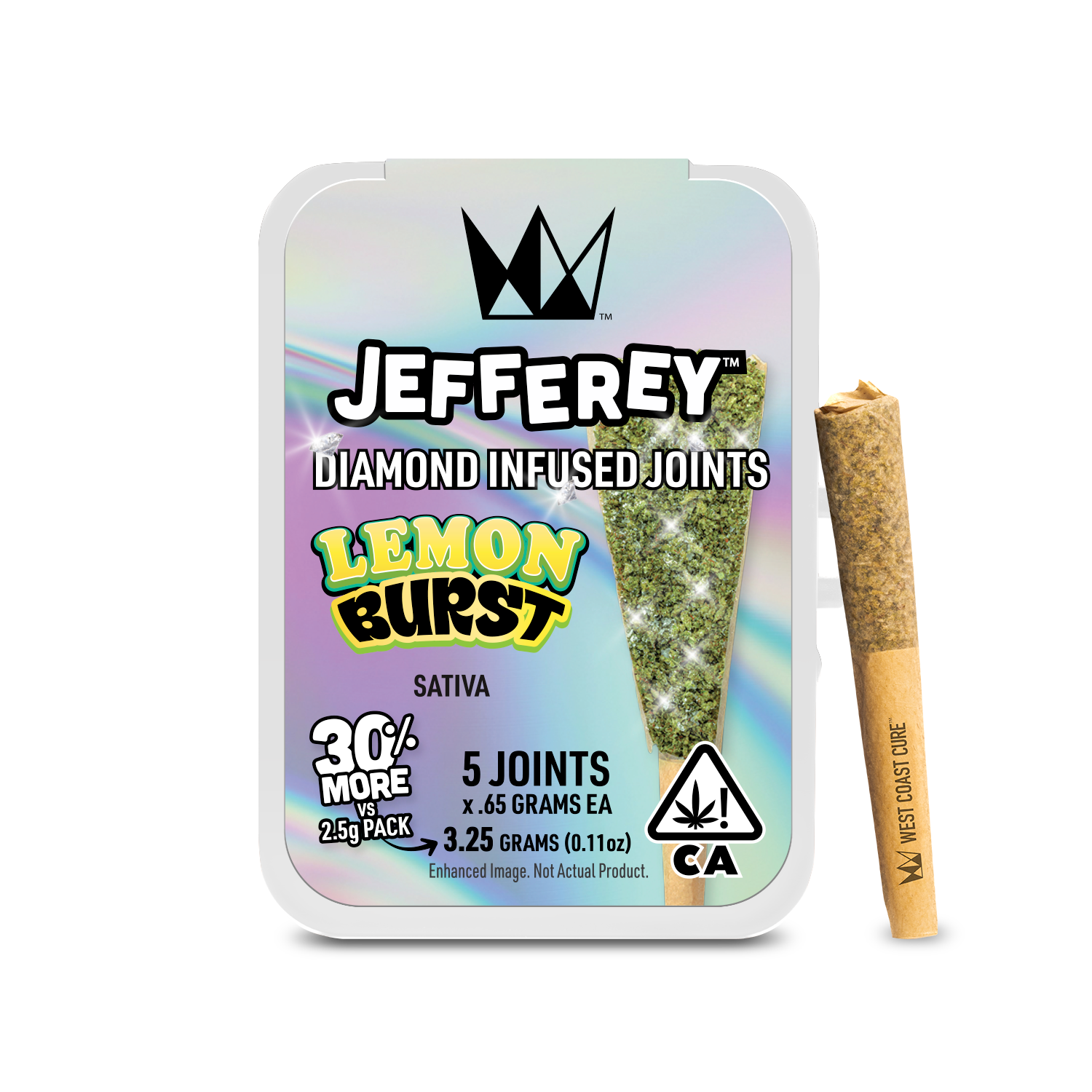 The Lemon Burst Jefferey .65g 5-pack offers an invigorating Sativa experience, ideal for enhancing creativity or social engagements. Each joint is carefully crafted using high-quality flower, infused with live resin diamonds, and dusted with top-shelf kief. The addition of all-natural terpenes enhances the robust, citrusy flavor, making this pack a premium choice for those seeking a potent and flavorful cannabis experience. Perfect for both new and seasoned enthusiasts.