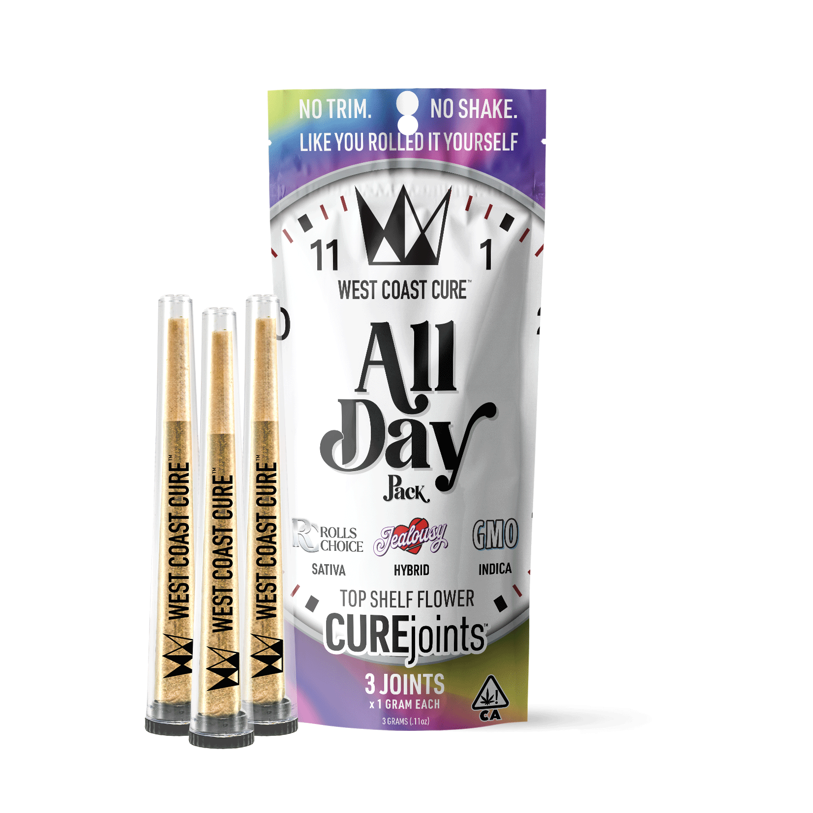 The All Day variety pack is your VIP pass to a full day of premium vibes. Kick things off with Rolls Choice (Sativa) for that early morning rocket fuel, slide into Jealousy (Hybrid) for a smooth midday cruise, and when the sun sets, let GMO (Indica) tuck you in for a chill night. Every joint’s packed with WCC’s finest, so you’re getting that top-shelf flavor and effect every time. Whether you’re looking to rise, ride, or relax—this pack’s got your whole day on lock. Go ahead, treat yourself like a boss!